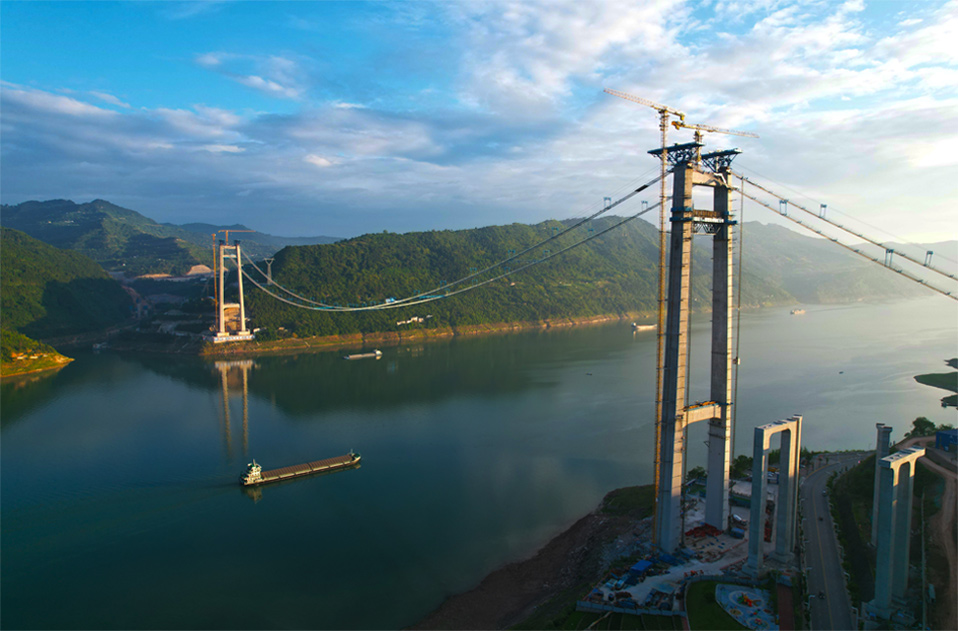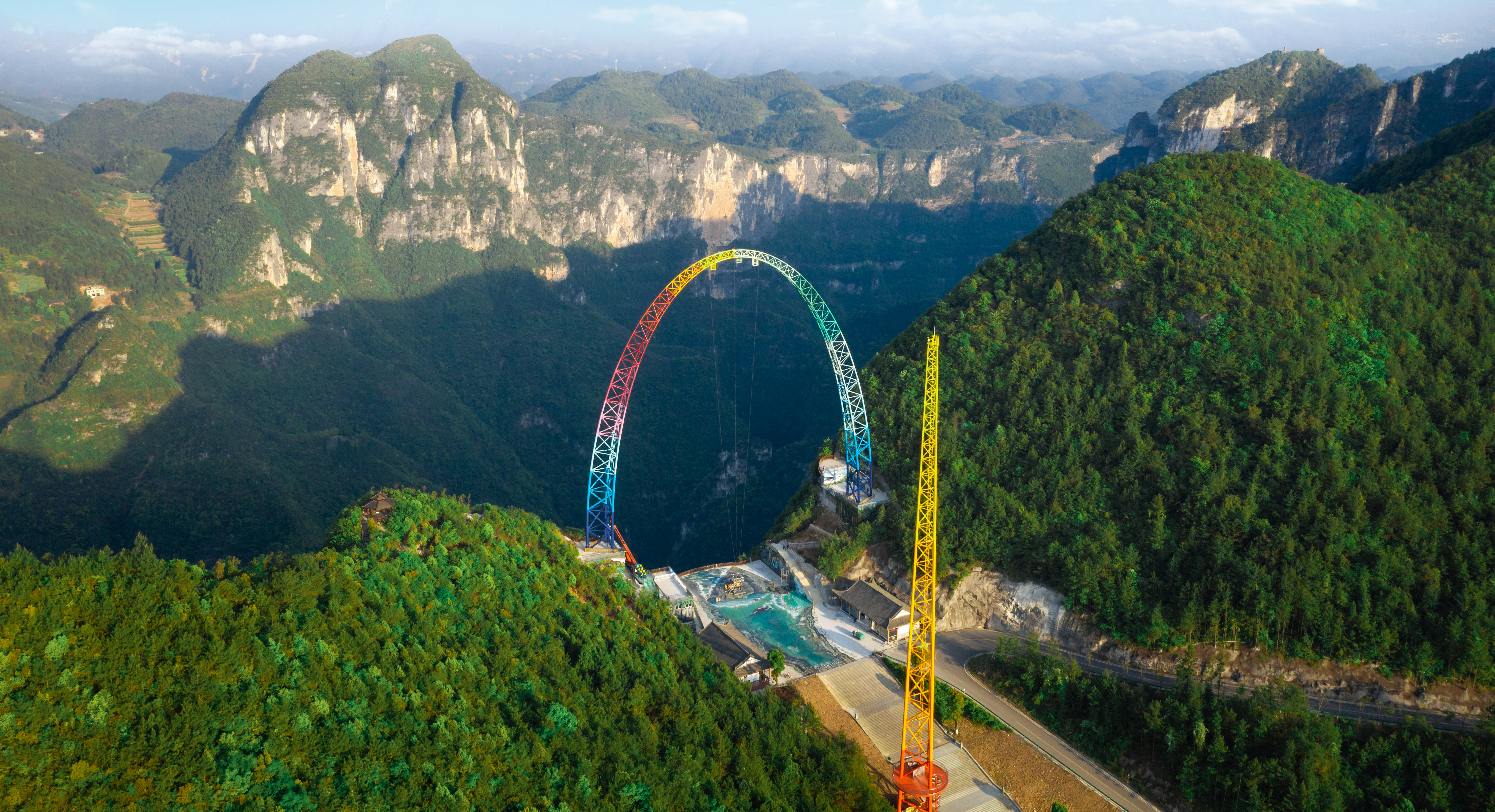 由中冶設備院自主研發(fā)、設計、制造、安裝的云端彩虹秋千,坐落于重慶龍缸5A景區(qū)700米的懸崖邊緣,主體由高100米、基礎跨距87.6米的彩虹涂裝拱形塔和高108米的提升發(fā)射塔等部分組成,該設備最大提升高度88m,最大運行速度可達130km/h,以“世界最高的框架秋千”稱號被載入吉尼斯世界紀錄。